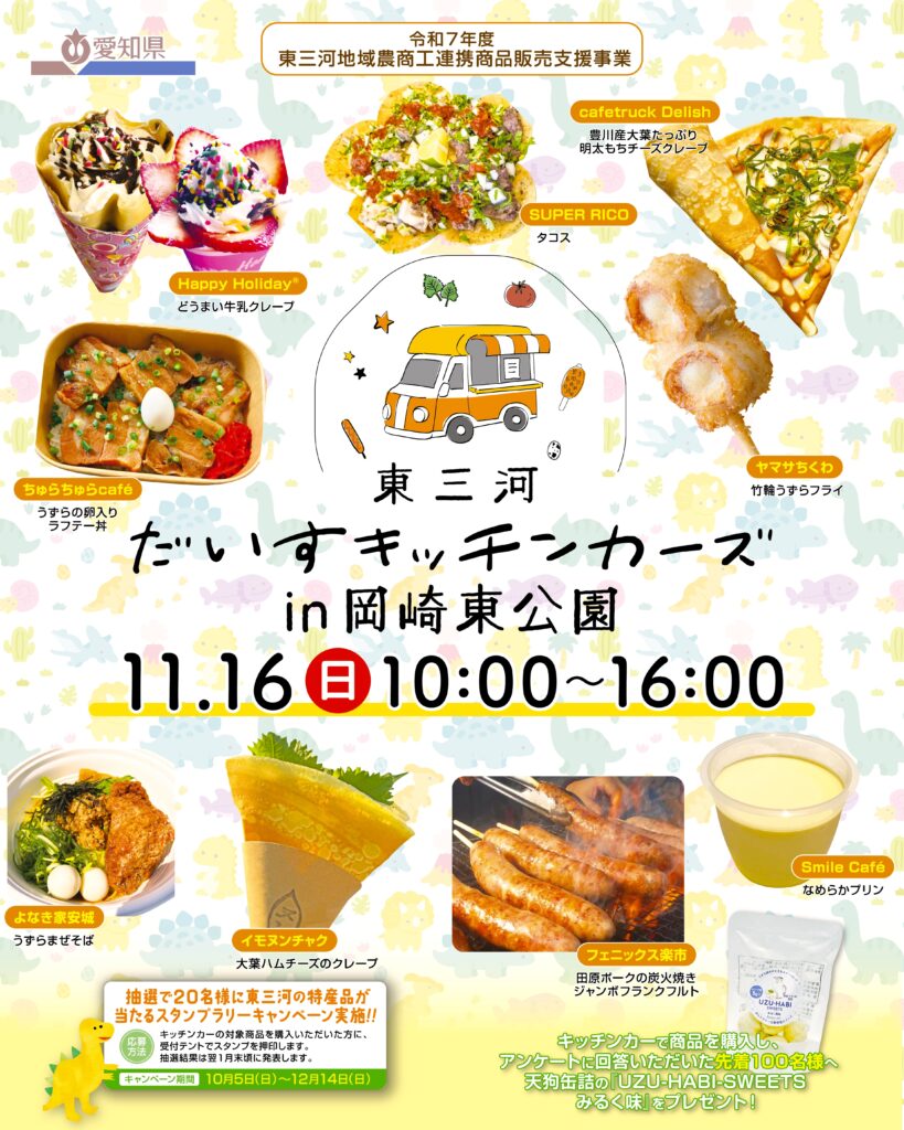 11月9日(日)に予定しておりました『東三河だいすキッチンカーズ in 岡崎東公園』は、雨天のため中止となりましたが、