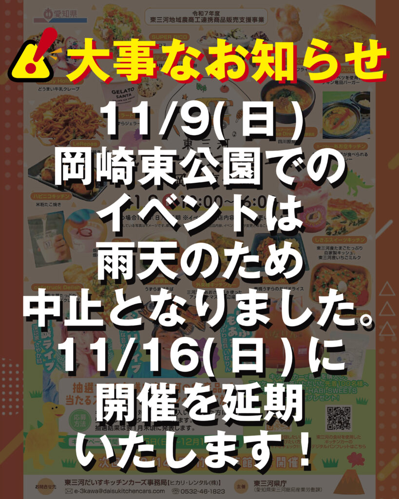 『東三河だいすキッチンカーズ in 岡崎東公園』は、雨天のため中止とさせていただくことになりました。