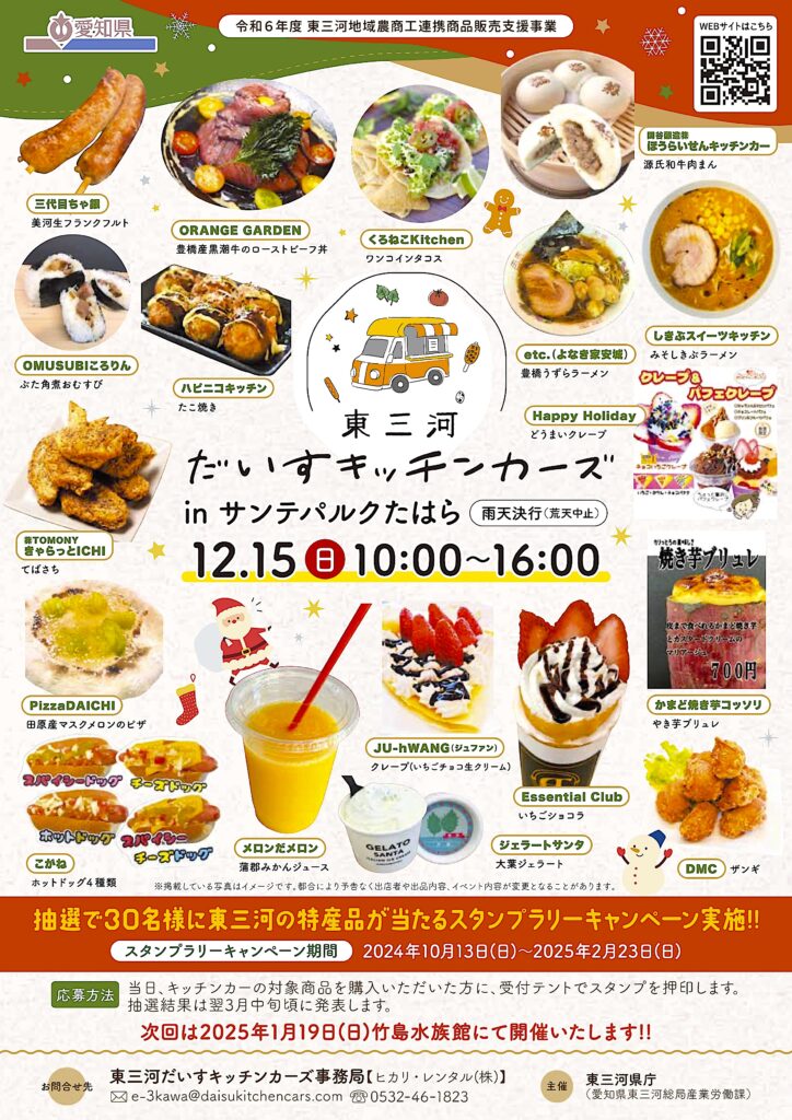 『東三河だいすキッチンカーズ』の販売キャンペーンの第3回目となるキッチンカーイベントを12月15日(日)10:00〜16:00田原市にある「サンテパルクたはら」にて開催させていただきます( *´꒳`*)
