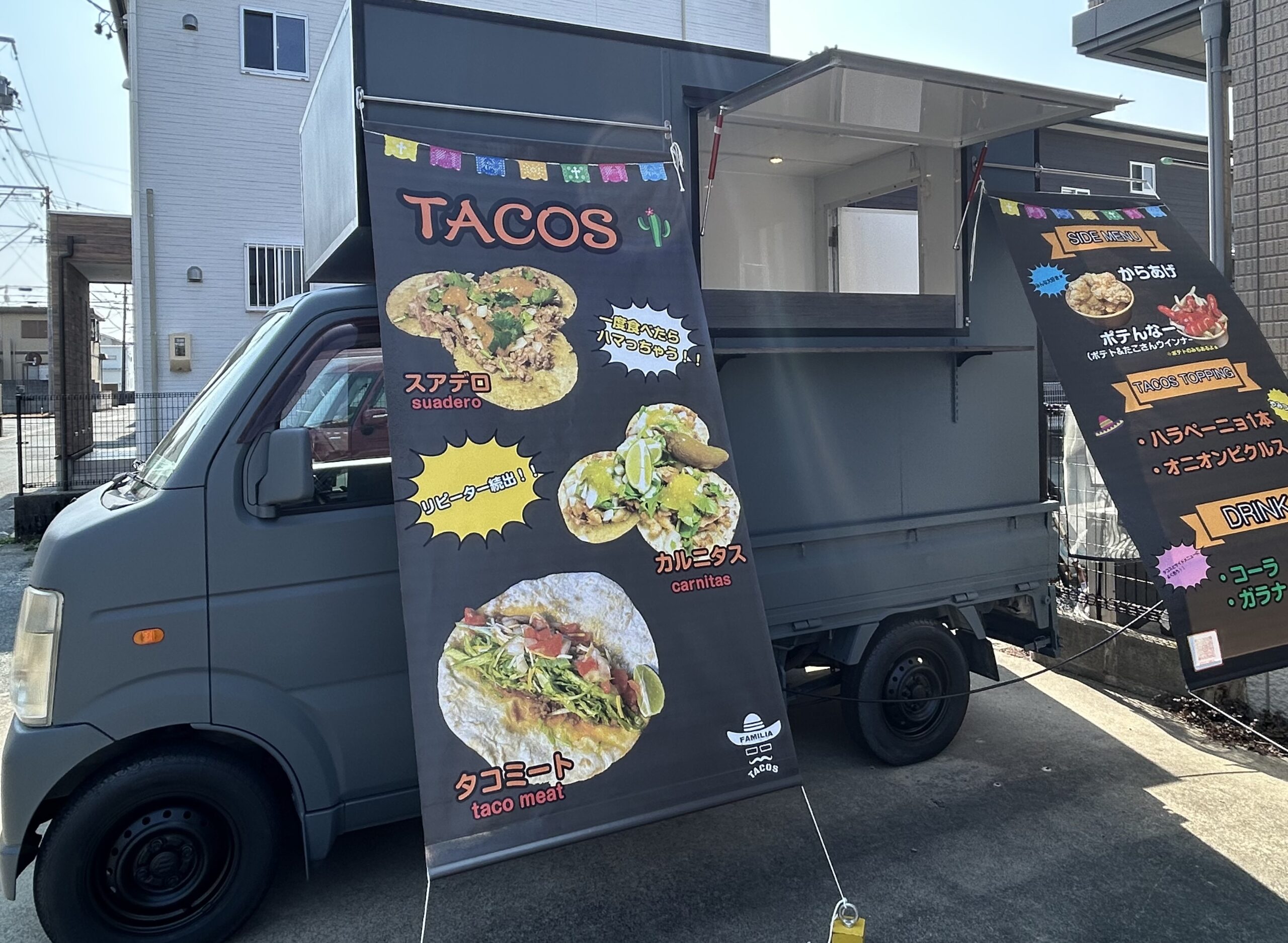 肉系軽食・スナック FAMILIA 基本情報 馴染みのあるタコミートはもちろん、スアデロやカルニタスと本格的なタコスも提供しています。一度食べたらハマっちゃう!?この機会にぜひご賞味ください。 屋号FAMILIA出店エリア豊橋市・豊川市・新城市提供メニュータコミート、本格的なタコスなど Instagram カルニタス4枚1600円 スアデロ4枚1600円 タコミート500円 その他メニュー ・Fチキ:1000円・ポテト:400円・ポテんなー:600円